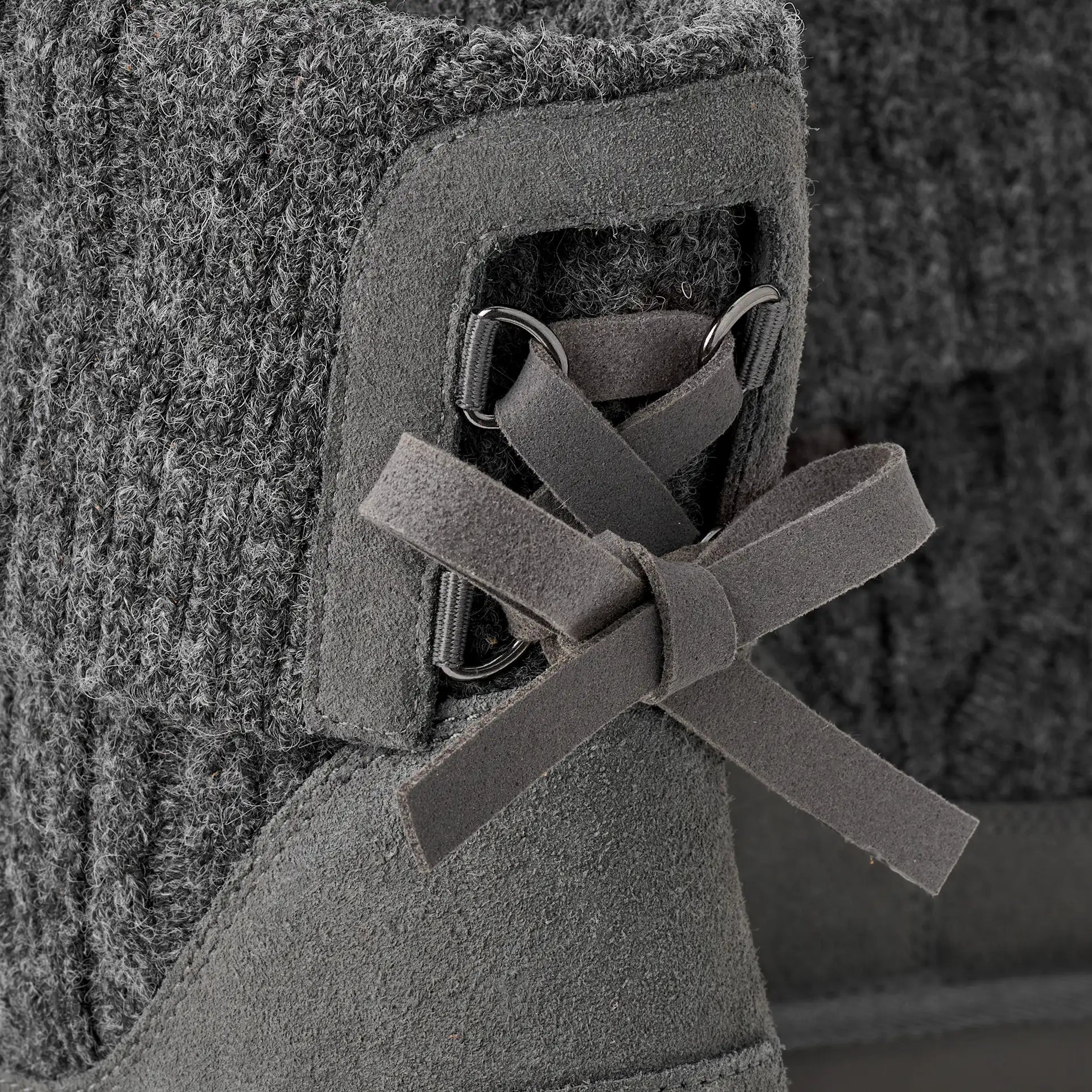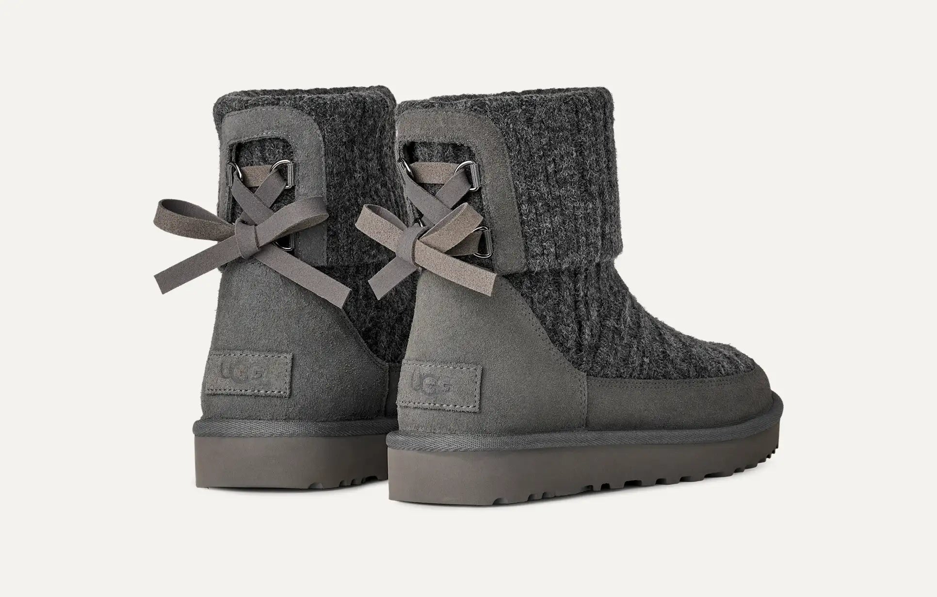 Our Classic Mini Cabelle knit. Perfect for enjoying a cup of hot chocolate, it features an upper reminiscent of the cable-knit sweater you love. Featuring smooth suede details, it also features matching suede laces and a metal ring closure at the back.